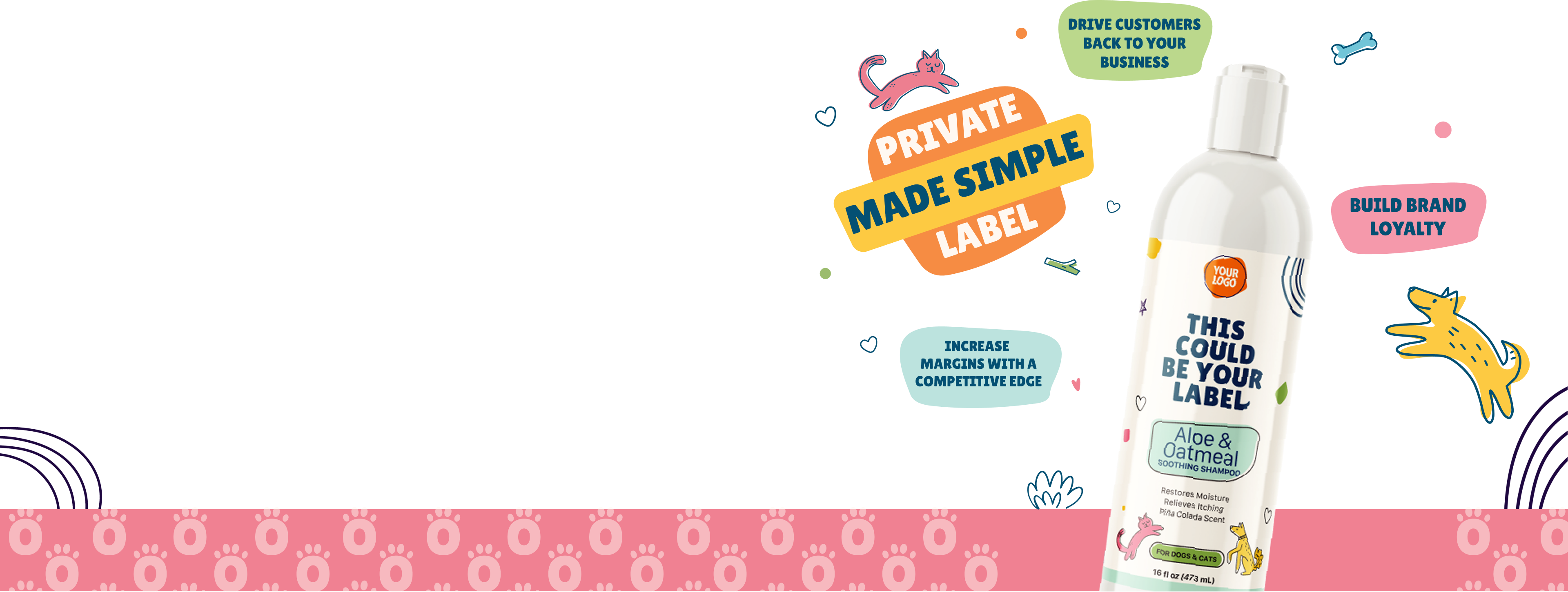 · Aloe & Oatmeal Shampoo for Private Label: A gentle, hypoallergenic shampoo designed for pet brands focused on soothing and moisturizing solutions for sensitive skin.